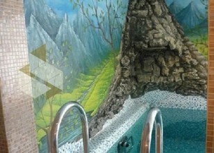 Вам понравится просторная аквазона, оформленная плиткой в виде мозаики и изображением красивых летних пейзажей. Гостям захочется окунуться в большой бассейн, наполненный чистой артезианской водой из собственной скважины и системой подогрева, гидромассажем и гейзером. Аквазона также оборудована удобными душевыми и обливным ведром.